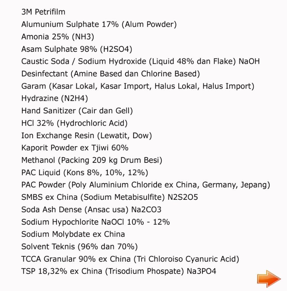 Kami Juga memiliki beberapa produk bahan kimia industri / bahan kimia teknis untuk pengolahan air serta pengolahan limbah. dan Kami juga memiliki produk dari 3M yang merupakan food safety product.